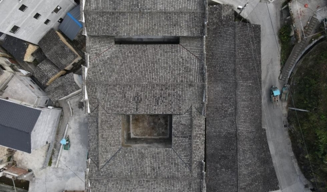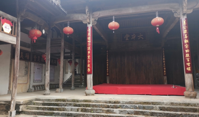 此宗祠明代始建,坐西北朝东南,三进两天井,二层建筑,两侧马头山墙,硬山顶