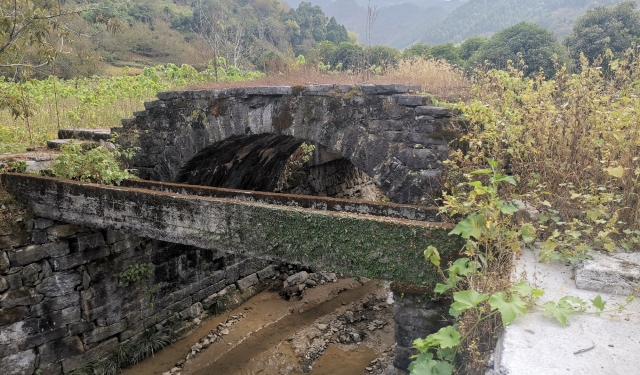 位于厚屏自然村朱家西侧800米处。据该村朱后杰(84岁)介绍,此桥始建于清代,单孔石拱桥,东北西南走向横跨考川溪,溪水自东南流向西北,桥长 7米,桥宽 3.45 米,桥高 4.9米,跨度 4.6 米,矢高 2.4 米,桥顶面主出地面 0。4 米,供圈并列砌置,桥东南侧拱券上阳刻“考般桥”,西北侧原题刻被撬,此间座落在田野中间,是原考川,朱家出入必经之道,