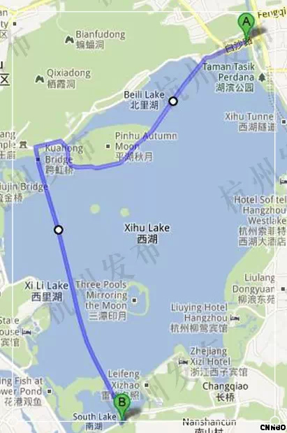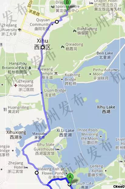起点:曲院风荷公共自行车租赁服务点,靠北山路和杨公堤