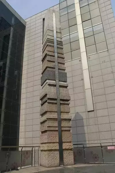 现在的原点标志雕塑主体由取自杭州各个区域的石头方砖堆砌而成,标注着1913年至今的不锈钢尺,从坐标原点一直延伸到石柱的顶端,象征着杭州这座城市的不断成长和拓展。