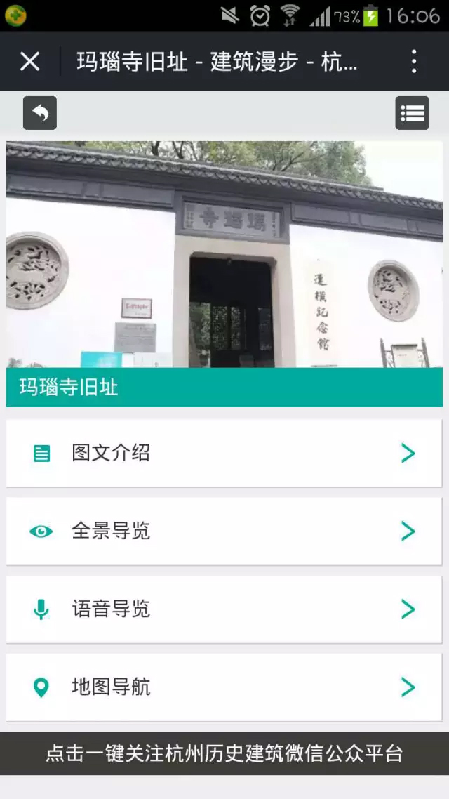 杭州历史建筑微信公众平台“精品赏析”栏目重磅推出孤山玛瑙,古刹庭院——玛瑙寺旧址微信智能导览,今日上线,让我们一同领略她独特的魅力吧!以下为专题页面。