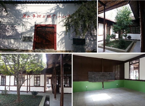 河上镇中心小学(前身为环河初等小学堂)创建于清末光绪年间,现存校址坐落在萧山区河上镇槐树路57号,是萧山南片地区历史最悠久的小学,具有杭州郊县地区木结构教学建筑的典型特色。该处历史建筑入口为墙门式,围墙粉白、高大,建筑整体共四进院落,每一进建筑均为一层三开间,木结构,房屋均以连廊相接,较有特色;屋顶为双坡硬山小青瓦屋顶,粉白外墙上有砖拱券,建筑门、窗均为木质门、窗,窗顶上有通长的木板过梁,窗底有通长的窗台板。据当地居民介绍,该处建筑原为私塾,是萧山区目前仍在使用的最古老校舍。